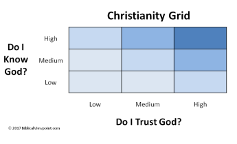 The Christianity Grid allows one to ask these two questions and rate your answers either High, Medium, or Low. A “Low/Low” answer to these questions would place one in the lower left corner; a “High/High’ answer would place one in the upper right corner – obviously an ideal. We can see that we can actually have gradations of a knowledge/relationship walk with God as well as levels of trust along a spectrum.